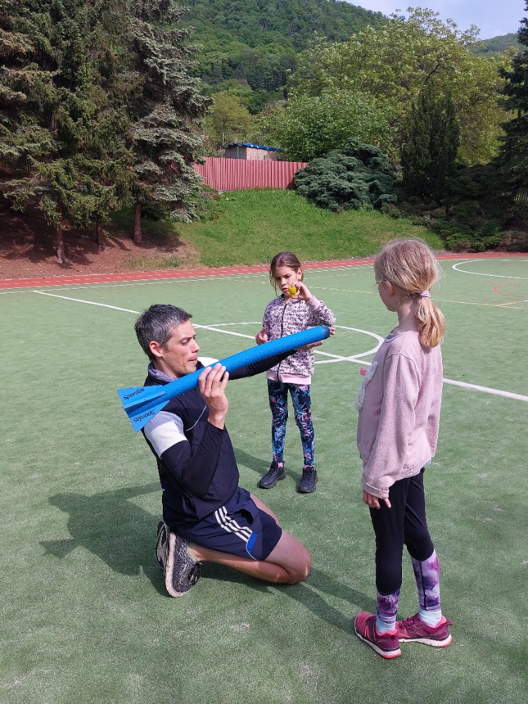 Na rozehřátí jsme si zahráli lístečkovou hru, následovalo společné rozcvičení a a atletická abeceda. Když jsme byli všichni rozcvičení, vzali jsme si rakety a medicimbaly a nacvičovali hod do dálky.