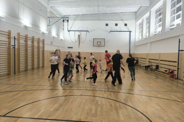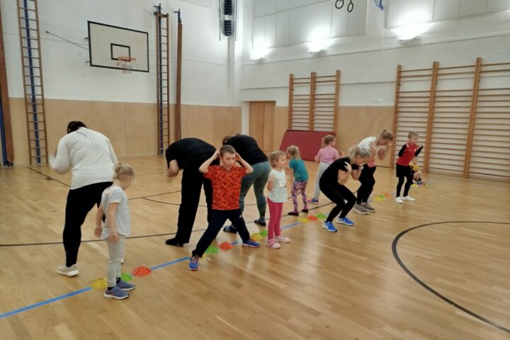 A to na téma BĚH – mladší děti sportovaly s rodiči v tělocvičně a starší vyrazily společně na hřiště u ZŠ.