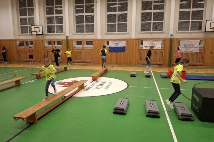 Tentokrát jsme trénovali v hale a použili lavičky, švédské bedny a aerobní schůdky.