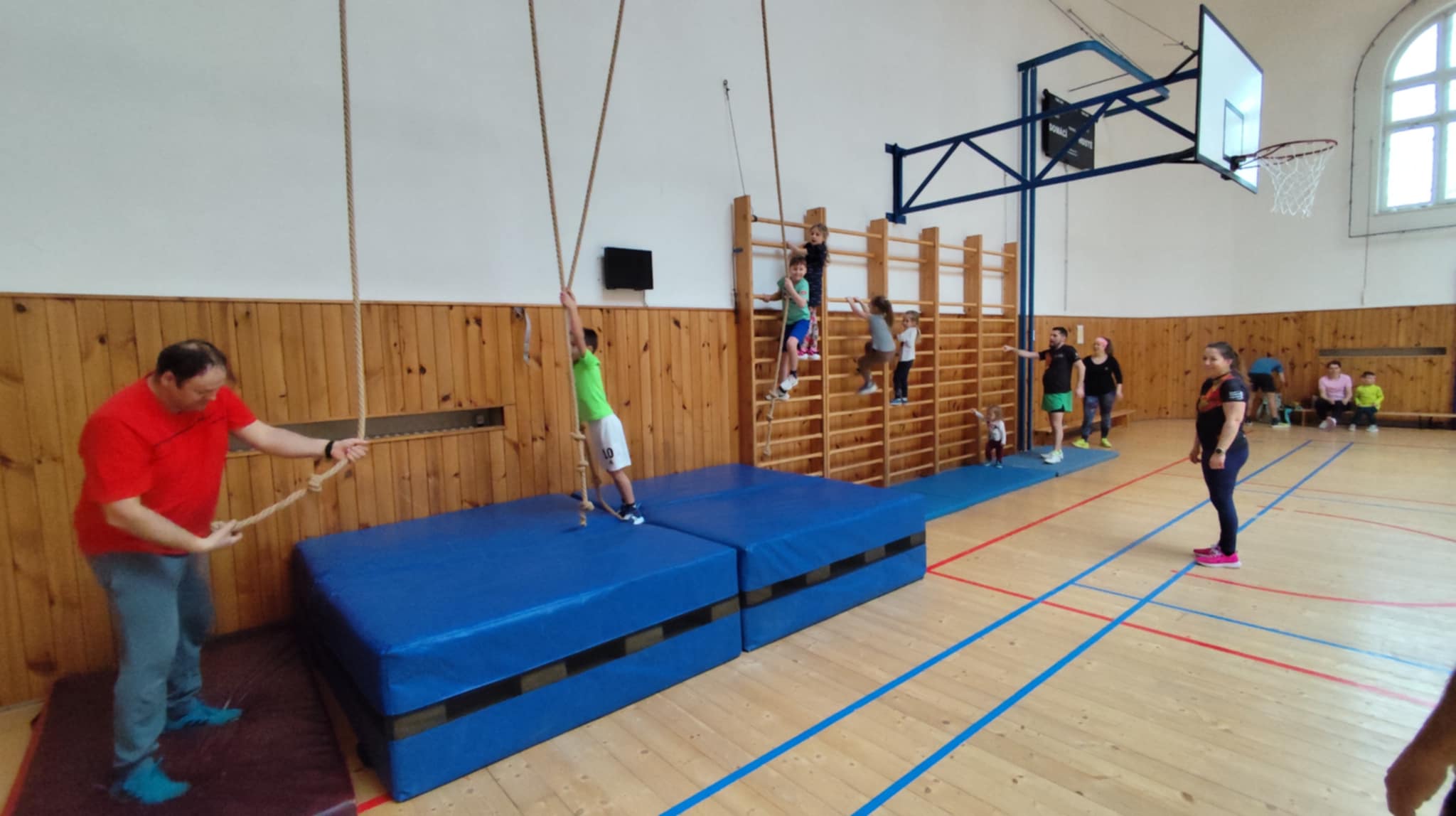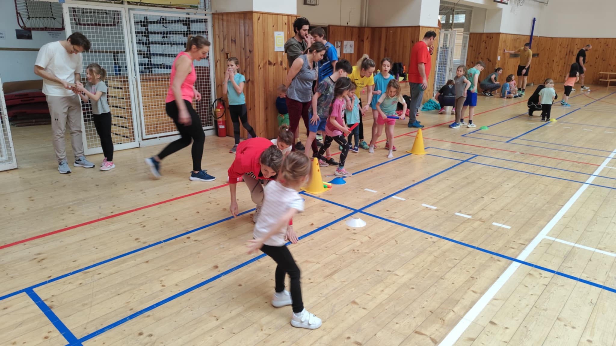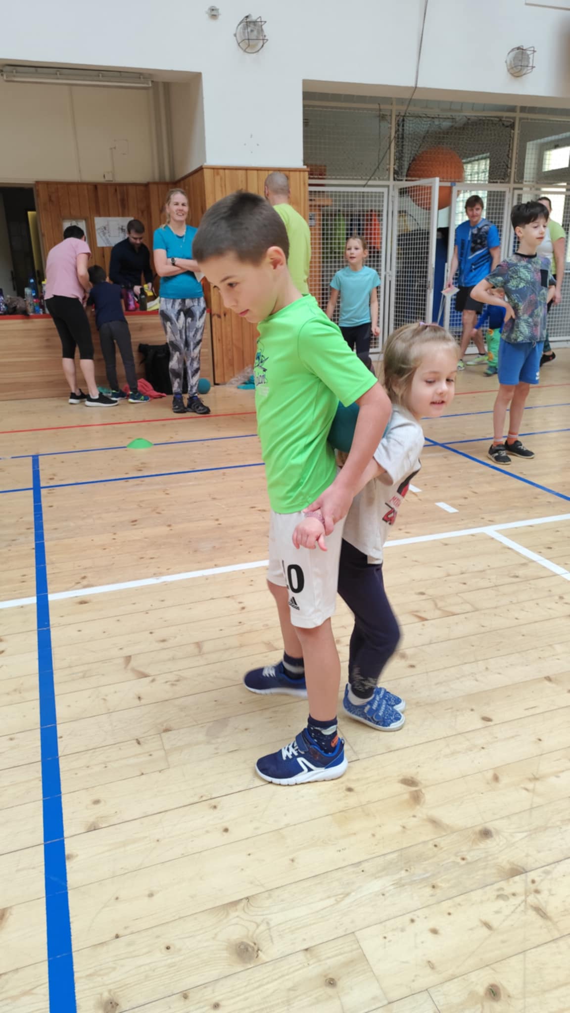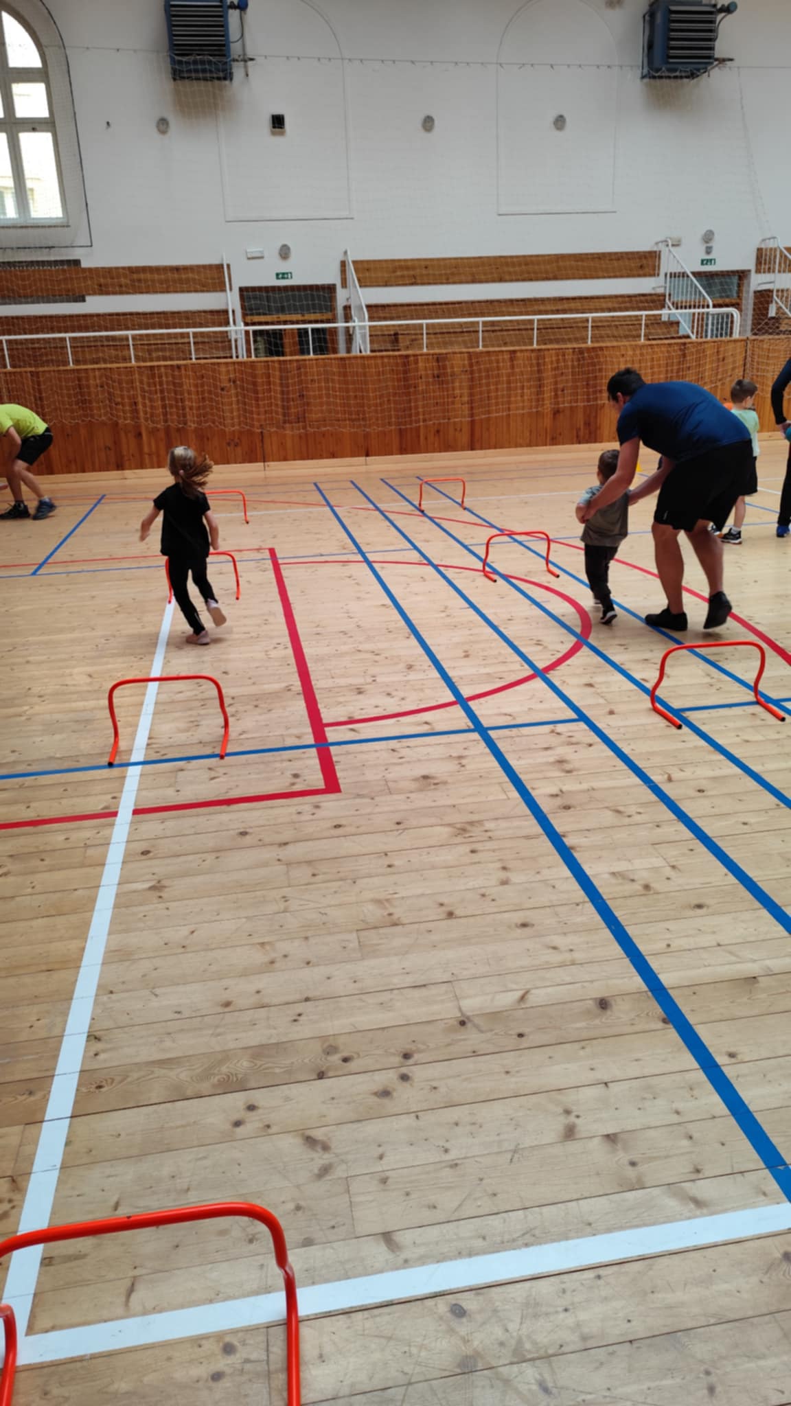 – po tělocvičně bylo připraveno 6 stanovišť – překážky, běh s míčem, štafetový běh, běhání od čáry k čáře a pro zpestření houpání na laně a střílení na bránu