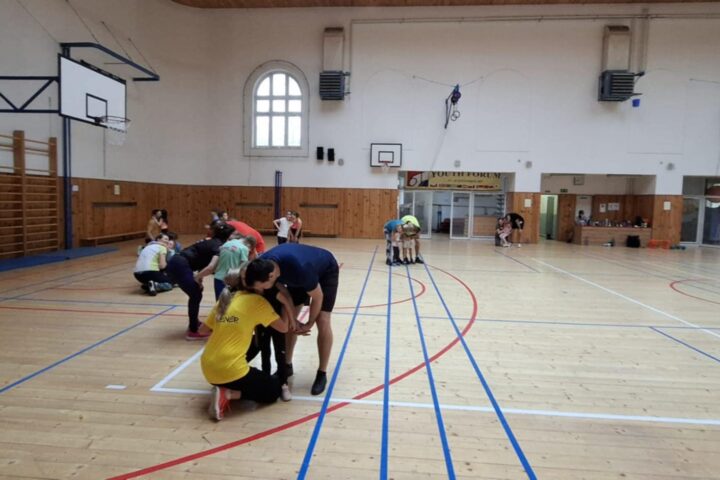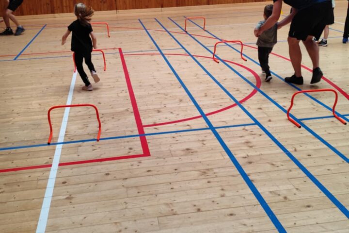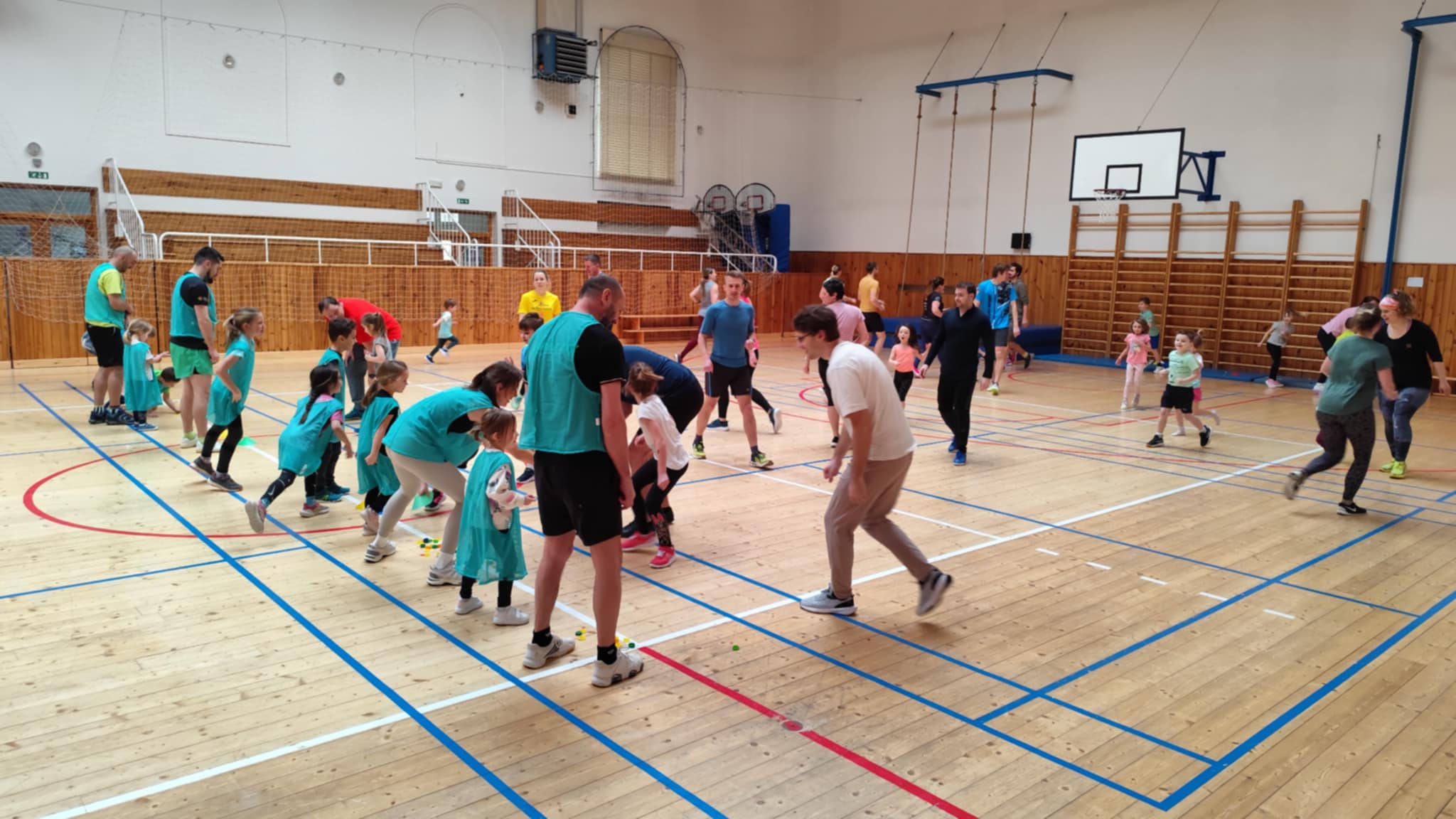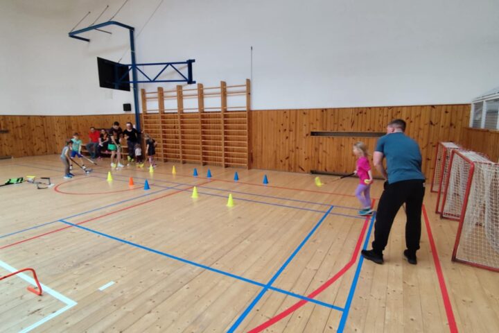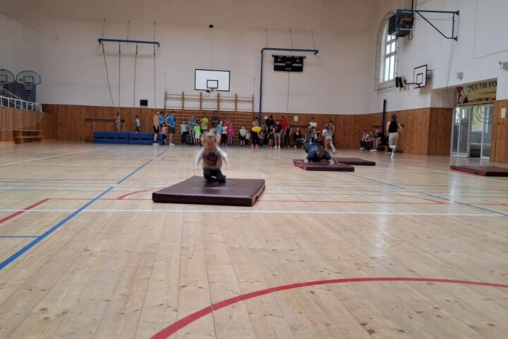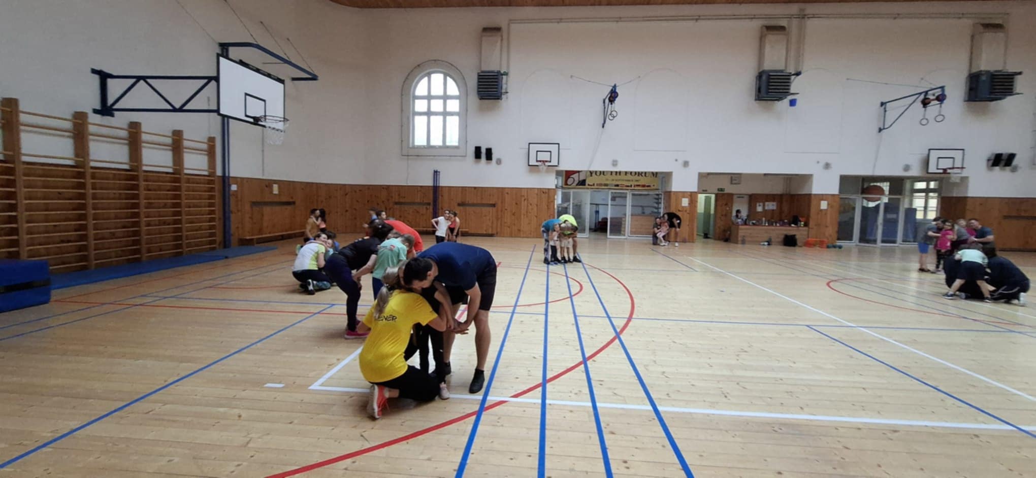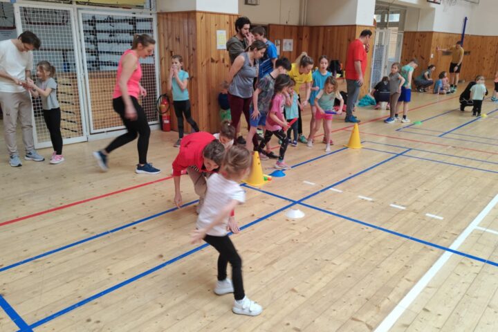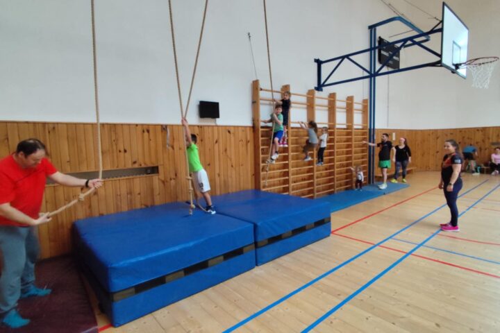 – po tělocvičně bylo připraveno 6 stanovišť – překážky, běh s míčem, štafetový běh, běhání od čáry k čáře a pro zpestření houpání na laně a střílení na bránu