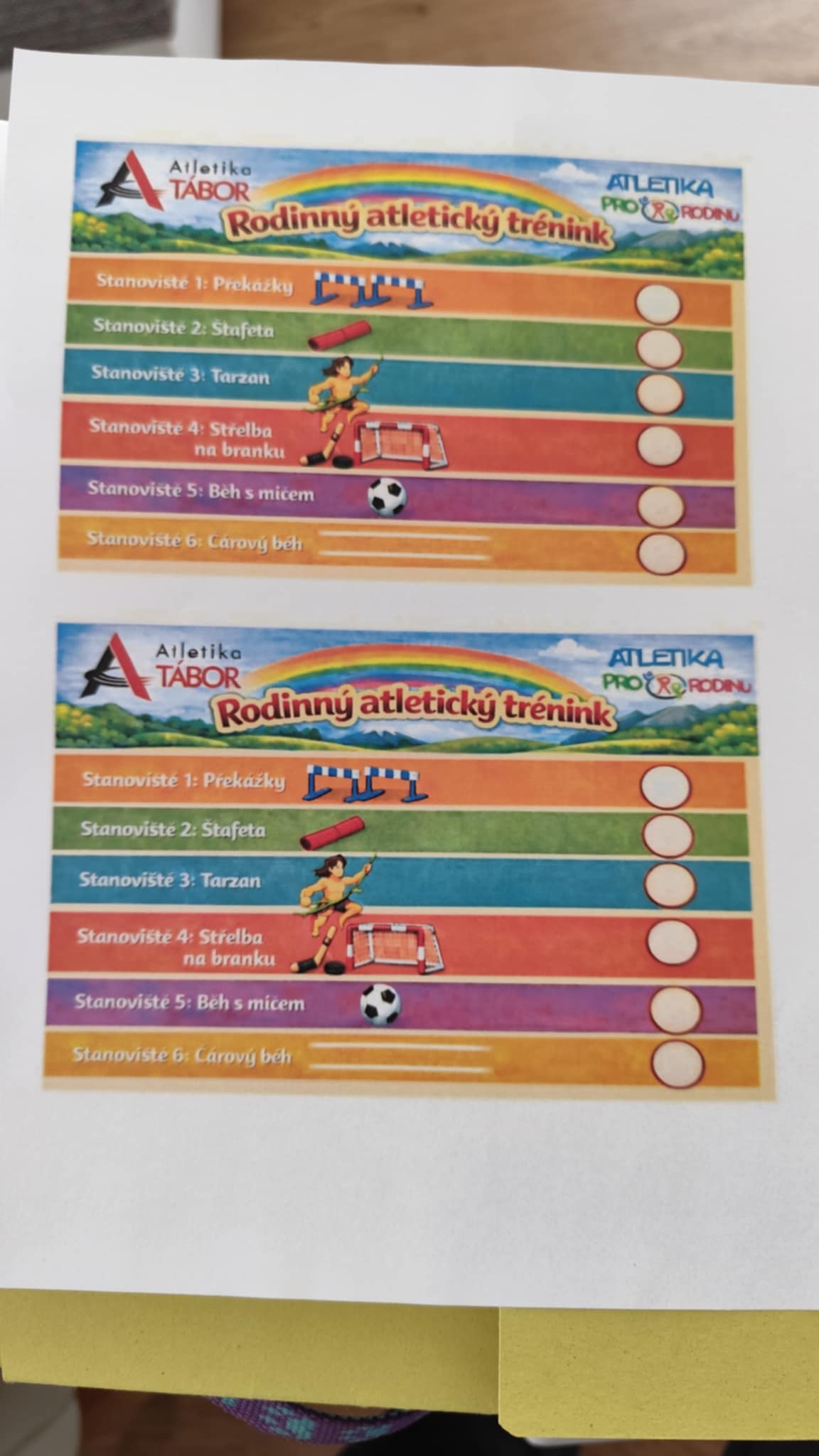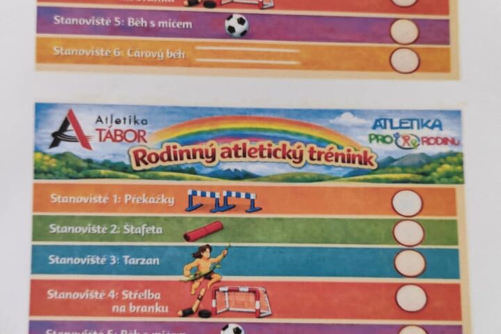 – každá rodina dostala námi vytvořené kartičky i s logem atletiky pro rodinu a logem našeho oddílu (viz foto), když rodina stanoviště splnila (u každého stanoviště bylo přesně popsáno, co vše mají dělat), dali si do kartičky razítko