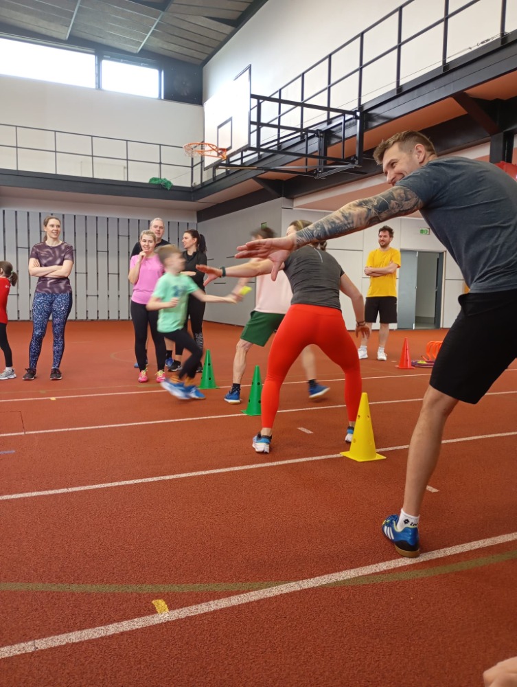 Tento trénink byl zaměřen na nácvik jedné disciplíny a to BĚHY. Jednalo se o člunkový běh, překážkový běh, vytrvalostní běh. Nácvik se týkal i slalomového běhu ve drahách, rodič proti dítěti, štafetový běh – byla ukázána technika držení a předávka štafetového kolíku, dítě vybíhalo a rodič dobíhal do cíle. Dále došlo i na běhy s různými úkoly poté slalom mezi mety, skoky přes cvičné překážky, skoky do kruhu a závěr sprint.