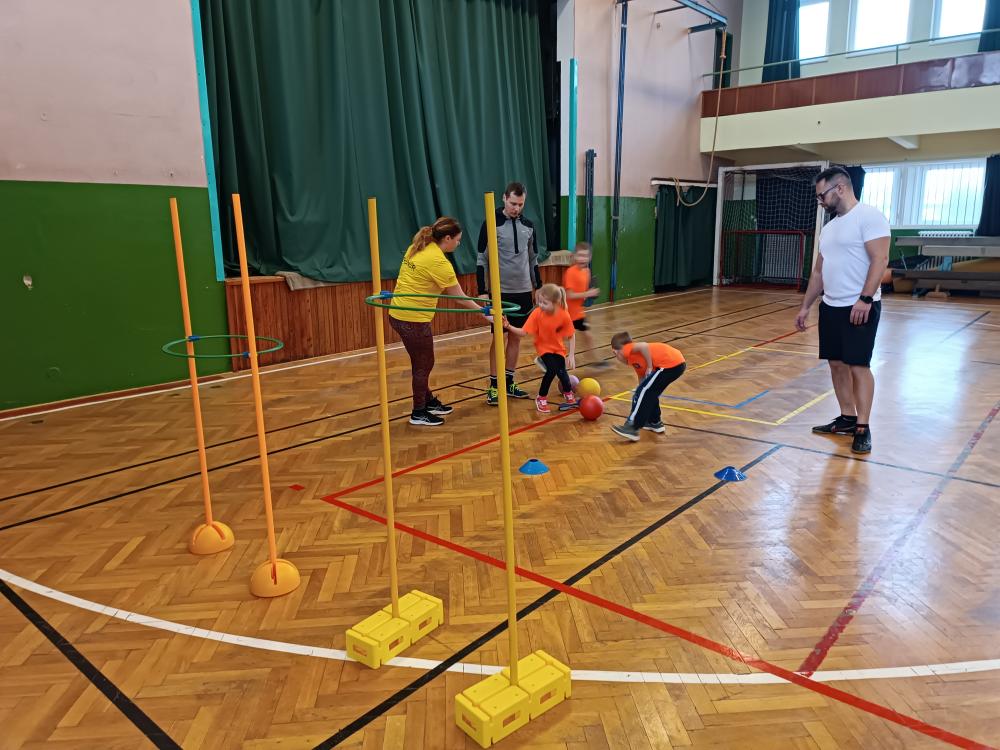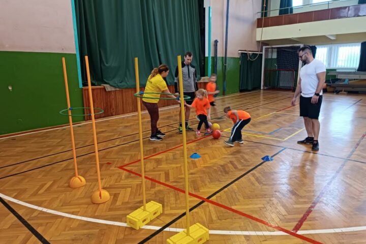 Děti rodičům ukázaly, jak umí házet raketkou, medicinbalem, jak umí házet na přesnost tenisákem do kloboučku, míčkem do kruhu.