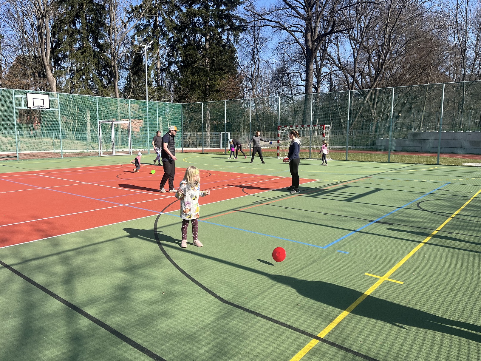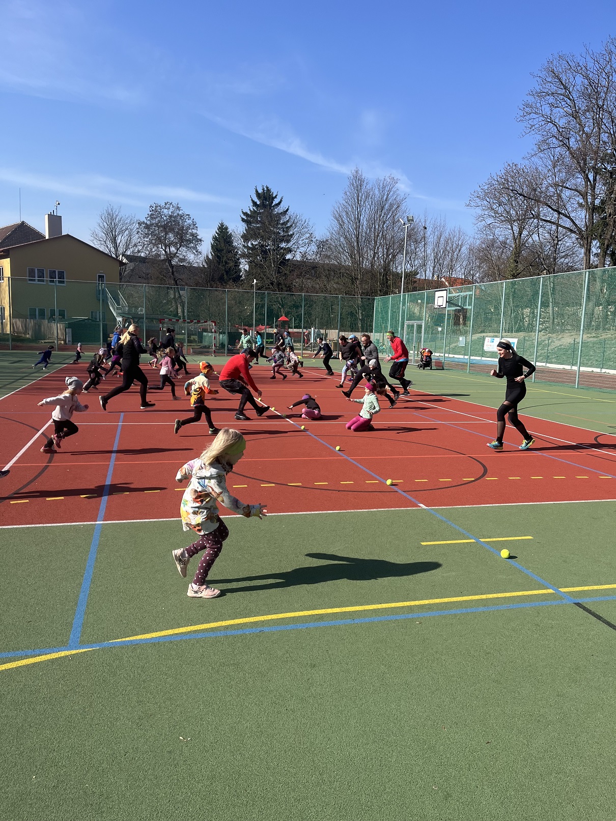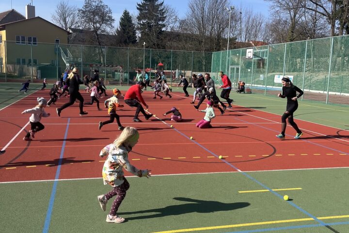 Nejprve nás čekal rozklus ve dvojici s tenisákem, který jsme použili i na dynamický strečink a polohové starty, kdy vždy rodič soupeřil se svou dcerou či synem o to, kdo bude rychlejší u tenisáku. Kdo prohrál, měl od vítěze nějaký úkol. Nejdojemnější bylo objetí a pusinky. Dorozcvičili jsme se ještě abecedou na překážkách, takže všichni určitě cítí po tréninku kyčle.