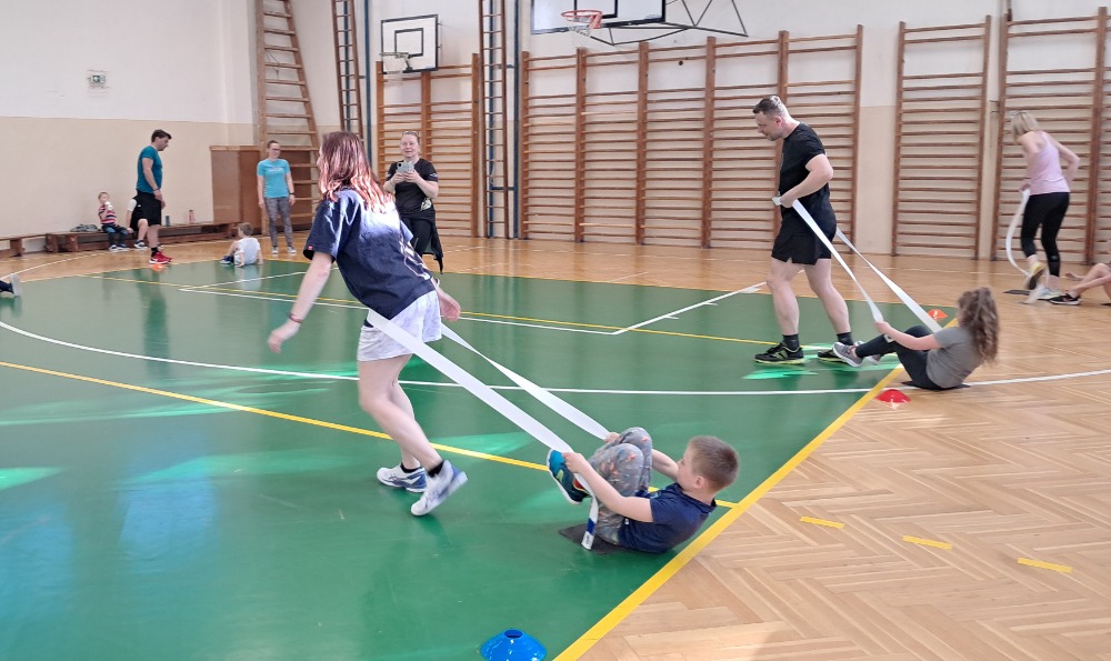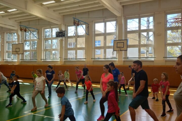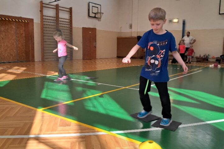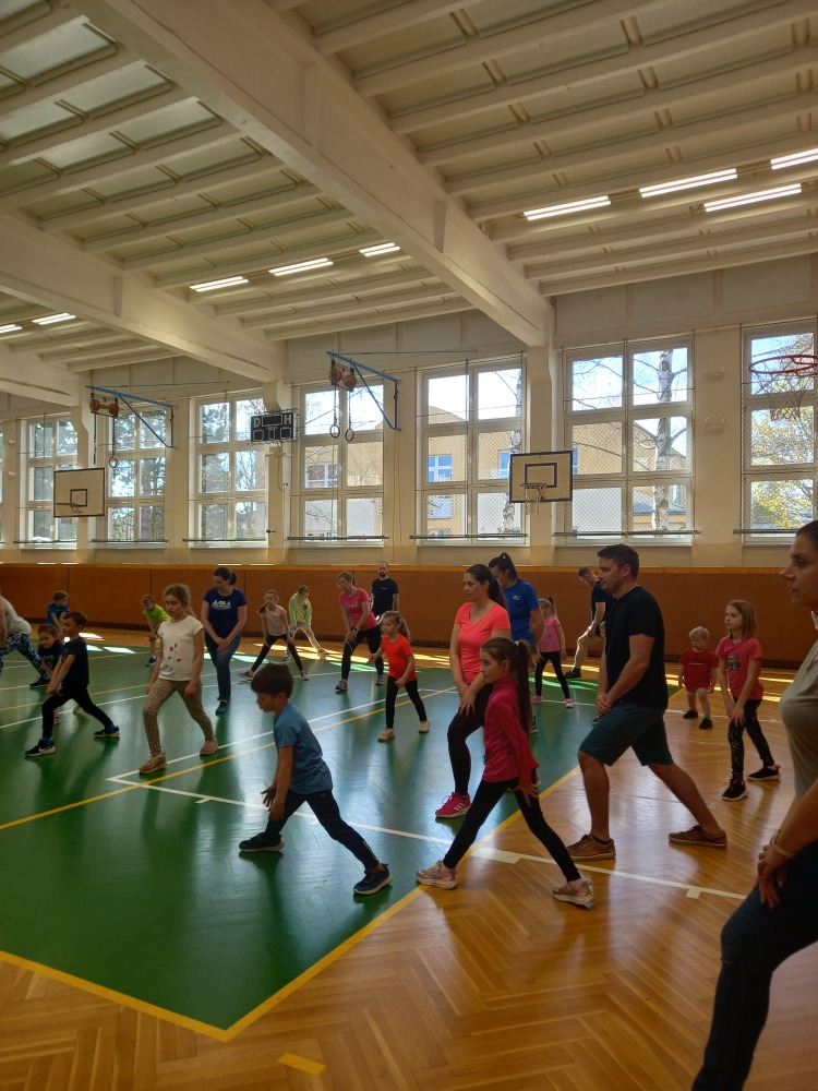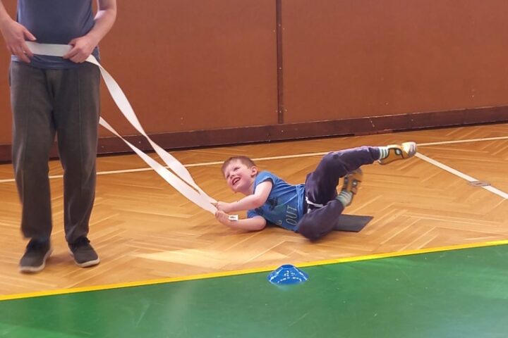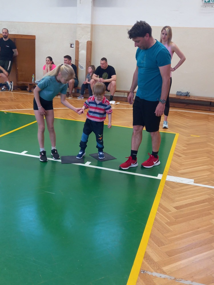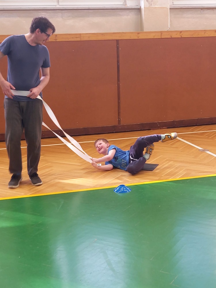 Zvládli jsme i logicko-početní úlohu, a to rozdělení velké skupiny do menších soutěžních skupinek 😊 Soutěžilo se v různých stylech běhu, skoku či jiném přesunu vpřed či vzad kolem kuželu a zpět. Nejen potomci vzali soutěžení velmi vážně, skupinky si mezi sebou nic nedarovaly. Po žabácích, racích a jiné havěti přišly na řadu koberečky a na závěr „vytírání tělocvičny“ – tahání menších členů skupin na pásech, a to původně v sedě, u některých postupně přecházející v leh.